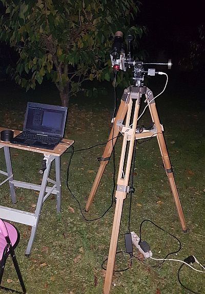31.10.2021 - M15 mit meiner mobilen "Sternwarte", dem 135er Walimex mit T7C und einem 50mm Sucher auf der EQ1 mit Schrittmotor in Stunde.