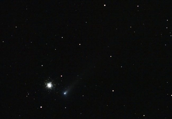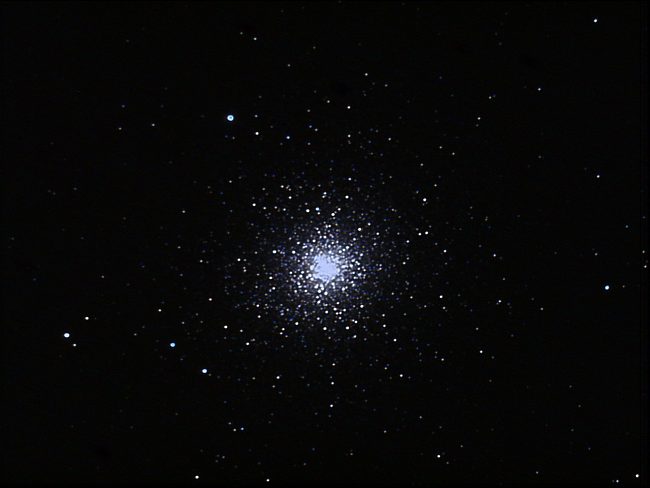 Um 23:30 geht es weiter. Die Sternwarte war schon vorbereitet und da es sich wieder zugezogen hatte, war ich eingeschlafen. Jetzt ist es richtig klar geworden und ich suche ein geeignetes Objekt zum Fotografieren. Zur Einstimmung nehme ich etwas Einfaches. M2 habe ich noch nicht fotografiert. Ich investiere 15 Minuten, was hier ausreicht. Das Zentrum ist schon ausgebrannt, man könnte es mit viel kürzerer Belichtungszeit versuchen, hier Strukturen sichtbar zu machen.