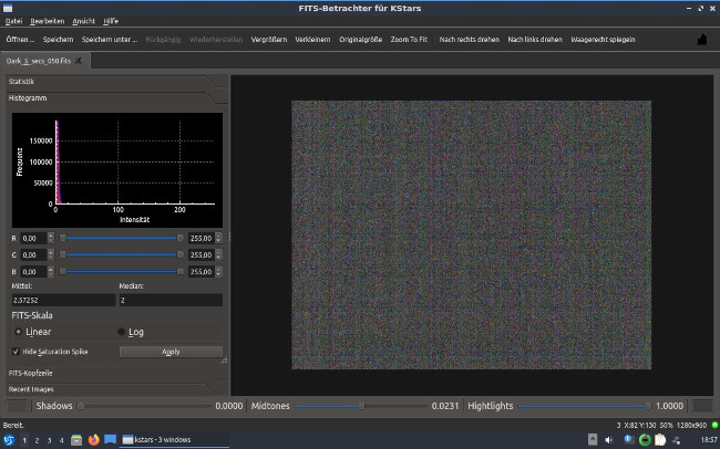 14.1.2021 allmählich kommt der Astro- Laptop mit Linux in Fahrt! KStars mit EKOS funktioniert jetzt auch mit der ALCCD5LII und langen Belichtungszeiten. Zum Steuern meiner EOS1000D ist Entangle installiert. Für Mond- und Planetenaufnahmen läuft Firecapture problemlos. Einzig mit der Einschränkung, dass bei der ALCCD5LII nur Belichtungszeiten von maximal 3 Sekunden möglich sind. Die Fernsteuerung über VNC funktioniert auch bestens, so dass ich von der Couch den Fortschritt meiner Astroaufnahmen beobachten und steuern kann. Der alte Laptop läuft mit dem Linux System recht flott und somit hat sich der Aufwand durchaus gelohnt. Ich muss jetzt nur daran denken, erst VNC zu starten und dann erst im zweiten Schritt auf das verknüpfte Laufwerk des Linux Laptops zuzugreifen, um die Bilder auf den PC zu kopieren. Heute gelingt auch endlich das Stacken der FITS Dateien. Dazu musste ich die Dateien per Fitswork mit Batch Verarbeitung konvertieren. Hier muss vorab eine *.fcm Datei erstellt werden, welche die Information zum Debayern enthält. Anschließend funktioniert das Stacken mit DSS und am Ende entsteht ein farbiges Bild.