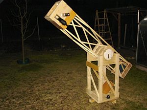 Die Wolken verziehen sich und so warte ich die Dunkelheit ab. Gegen 23 Uhr suche ich M57 auf. Fast auf Anhieb finde ich den Nebel. Trotz der unvollkommener Verhältnisse ist der Ring mit 112-facher Vergrößerung gut sichtbar. Jetzt kommt M13 an die Reihe. Auch er ist schnell gefunden. Hunderte von Sternchen blitzen im Haufen auf, die Struktur ist schön zu erkennen. Ich beobachte ziemlich lange und erfreue mich an diesem Anblick. Die Party der Nachbarn ist beendet und ich schalte die Gartenleuchten aus. Jetzt ist es deutlich dunkler geworden, die Milchstraße kann zwischen Schwan und Adler erahnt werden. Nur die hell beleuchtete Kirchturmuhr blendet. Als Nächstes habe ich M71 ausgesucht. Der Kugelhaufen liegt im Pfeil. Schwierig nur, dass die Sterne des Pfeils nicht alle mit bloßem Auge sichtbar sind und ich so eine Weile brauche, um sie im Sucher zu erkennen. Nach einer gefühlten Viertelstunde erblicke ich den Haufen, der wesentlich unscheinbarer als M13 ist. Zu guter Letzt, finde ich dann auch M27. Hier probiere ich noch verschiedene Vergrößerungen aus. Die 74-fache Vergrößerung gefällt mir hier am Besten. Gegen 0:30 stelle ich den Dobson wieder in die Garage. Fazit: der Bau des Teleskops war ein voller Erfolg, das Beobachten macht riesigen Spaß, ich hätte nicht gedacht, dass es sich mit hohen Vergrößerungen so gut arbeiten lässt. Die Fangspiegelhalterung könnte etwas stabiler sein, ich werde wohl vor jeder Beobachtung justieren müssen. Jetzt freue ich mich schon auf die dunklen Nächte im August, in denen ich mit dem Auto den Dobson ins Freie bringen werde und am Himmel spazieren sehen werde. Aber auch hier, im Zentrum von Mittenwalde, ist das Beobachten schon gut möglich, zumal die Vorbereitungen nur wenige Minuten dauern. |
