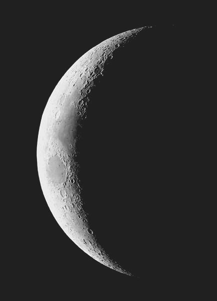 23.12.2013 - Ein Versuch mit dem 150/1200 Refraktor in Verbindung mit dem 2fach Konverter. Das Wetter ist sehr wechselhaft, laufend ziehen Wolken durch. Diese Aufnahme ist eine der letzten dieser Session. Gamma habe ich ganz lach links gestellt, so scheinen die Details besser hervorzukommen. Am Histogramm ist nicht mehr viel nach zu arbeiten. Viel besser als mit dem 80/1200 sind die Aufnahmen diesmal aber nicht. |