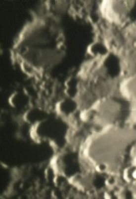 17.7.2013 Clavius am 203/1830 Dobson mit Sony DSC W1 mpeg Video 640x480 mit ffmpeg in Einzelbilder zerlegt und mit Autostakkert und Giotto weiterverarbeitet. Im Vergleich eine Einzelaufnahme unten. |