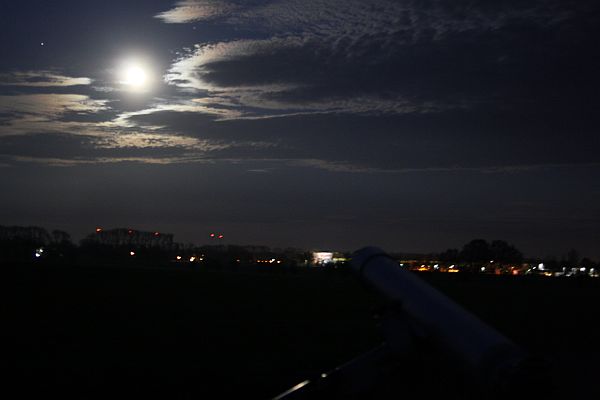 25.4.2013 - die "kleine" Mondfinsternis über Mittenwalde. Gleich schließt sich die Wolkendecke, aber ich konnte noch einige Eindrücke von der Finsternis sammeln. Mit dem 80/1200 Refraktor auf der 1b konnte ich einige Aufnahmen machen. Die mobile Technik hat funktioniert. Links vom Mond ist Saturn zu sehen, die geplanten Beobachtungen für die Zeit nach der Finsternis fielen den Wolken zum Opfer |