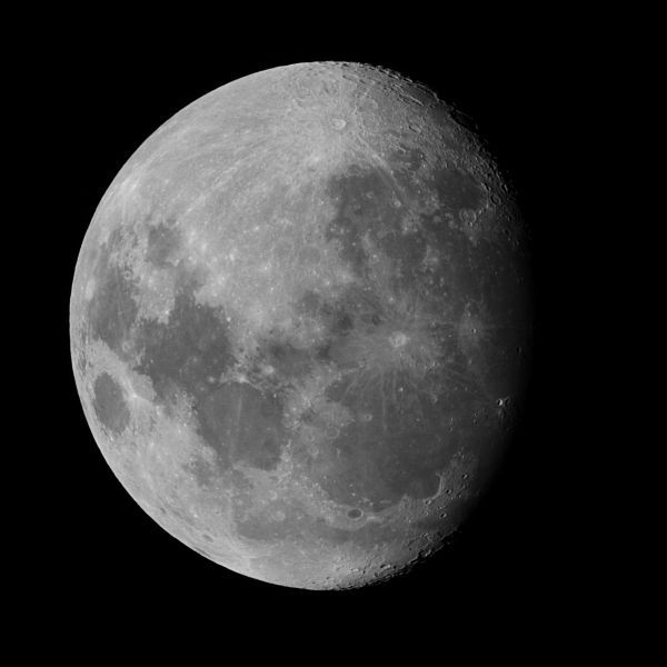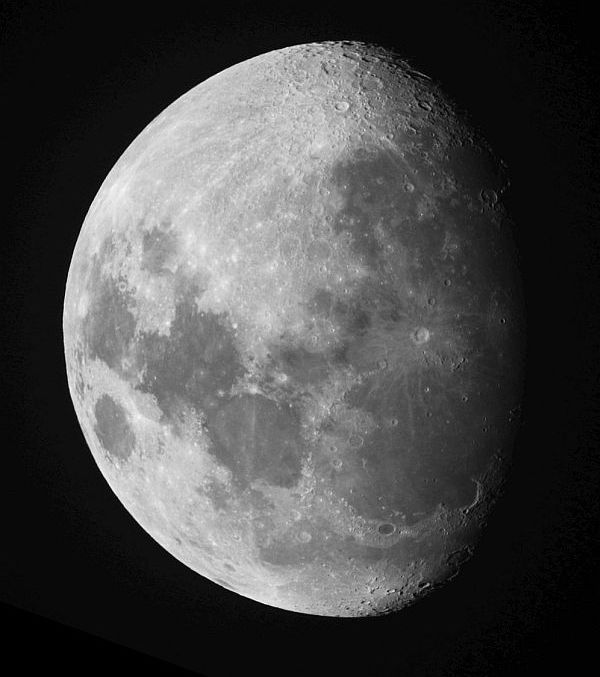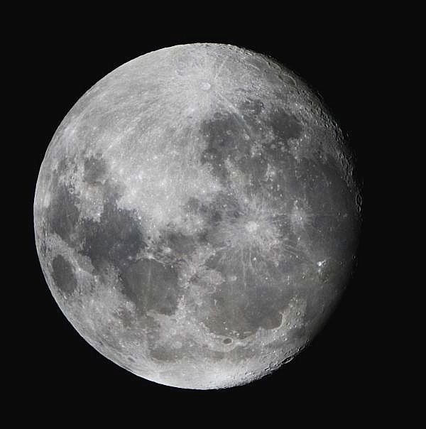 18.4.2013 - Der Mond im direkten Fokus des Dobson mit der Canon EOS100D am stehenden Fernrohr. Dank der Lichtmenge sind viele Einzelheiten sichtbar. Es lont sich also durchaus, am Dobson den Mond zu fotografieren. |